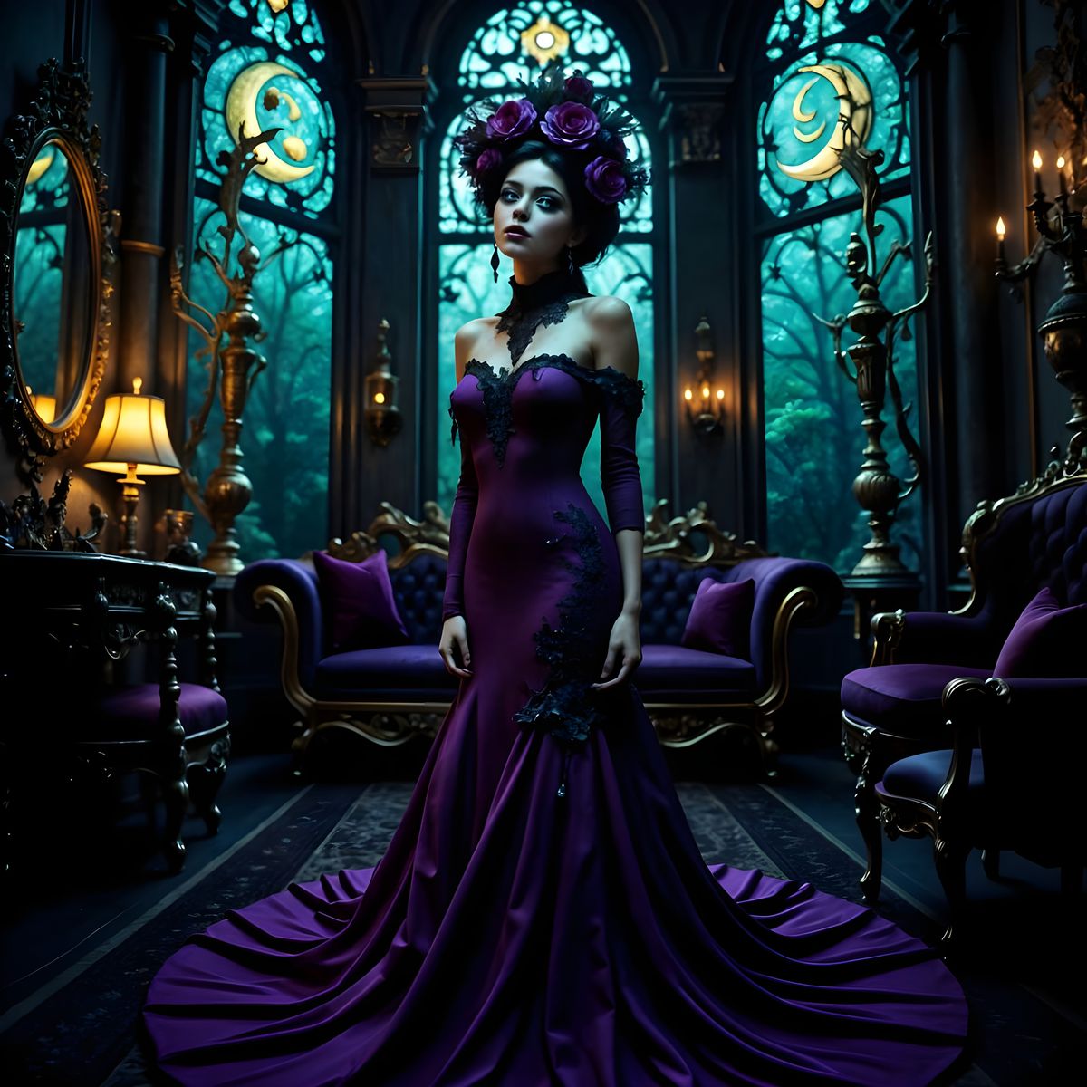 This image shows a gothic Victorian woman in a dimly lit, ornate parlor. Hyperrealistic style with Bohemian glamour and luxurious fantasy elements.