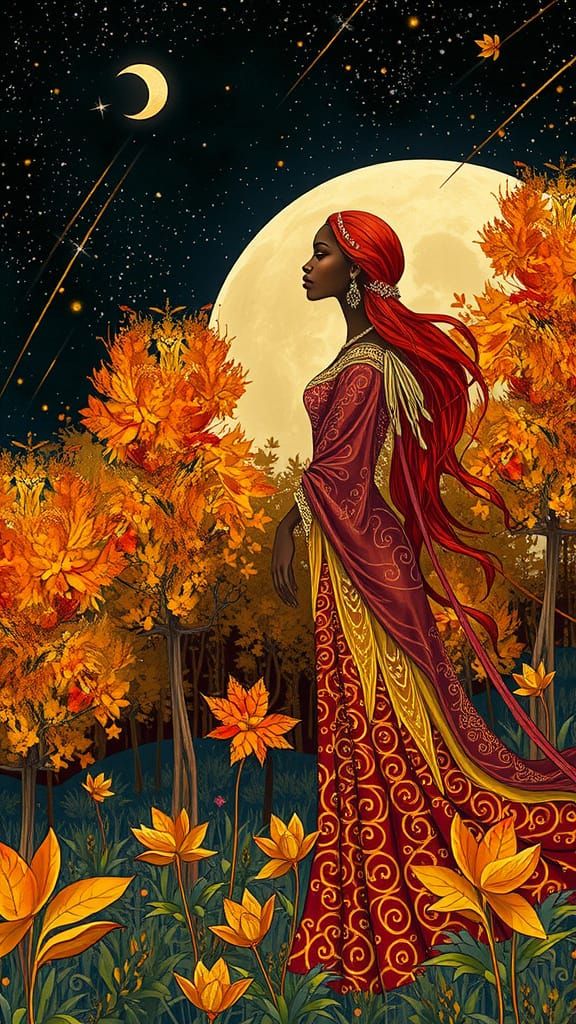 This image shows an elegant African woman with long red hair and a flowing red and gold gown, standing in a magical autumn forest at night under a glowing full moon and starry sky.