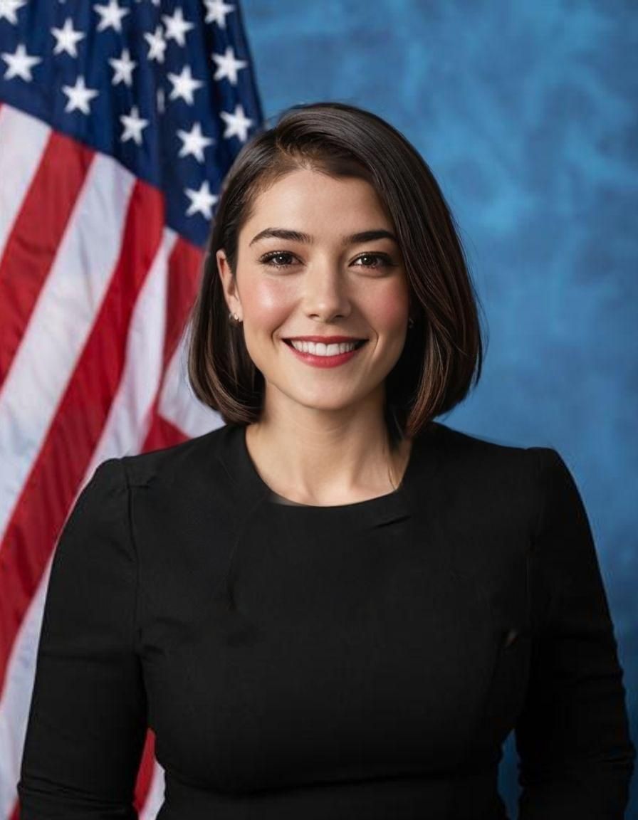 A photorealistic portrait of a smiling woman with a bob haircut in a black dress posed in front of an American flag. The professional quality image has a vibrant blue background and subtle lighting.