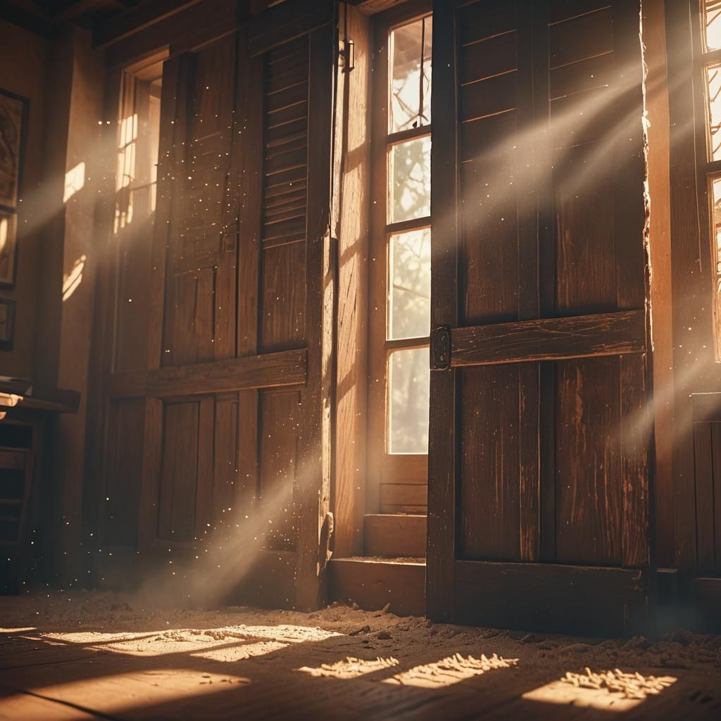 This image shows sunlight streaming through a wooden shutter, illuminating dust motes in the air. A cinematic digital matte painting featuring vibrant, warm colors and detailed textures.