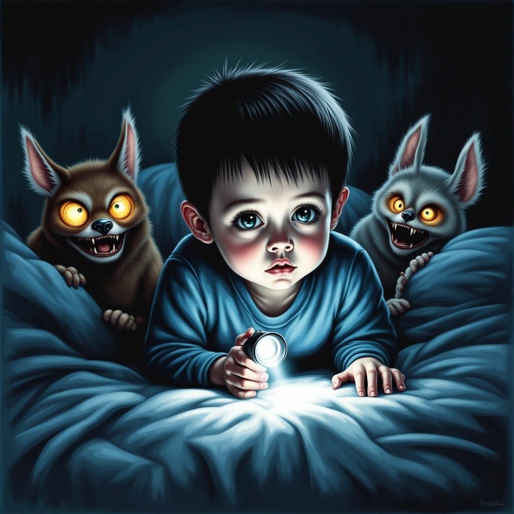 This image shows a child in pajamas, flashlight in hand, cautiously looking under a bed. A furry, glowing creature peers back playfully in a cyberpunk aesthetic.