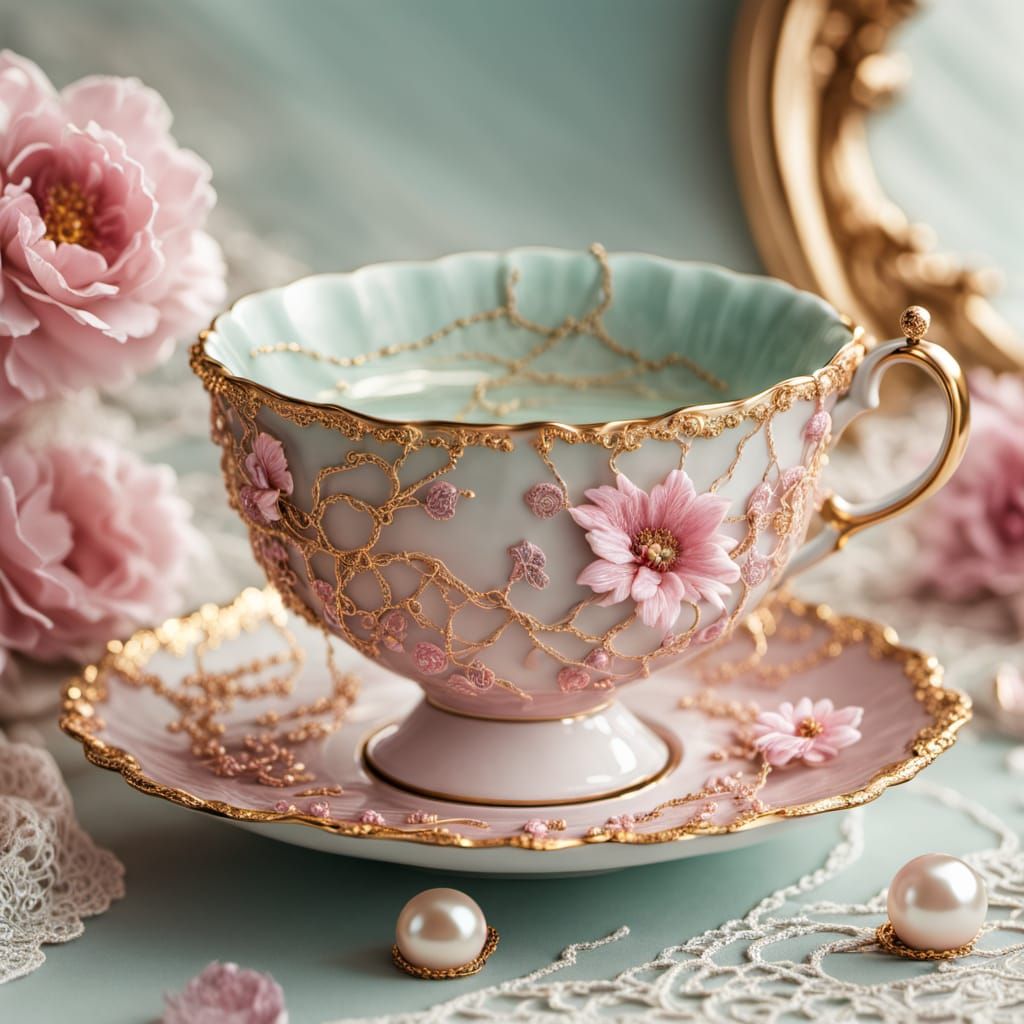 3D Teacup Microcosm, A multi -level knolling composition of a surreal microcosm inside a cracked porcelain teacup on a lace-covered vanity in a pretty room: a knitted wool garden surrounds a glowing embroidery arch revealing a honeycomb world sewn with floral motifs and openwork gold thread. A floating ...