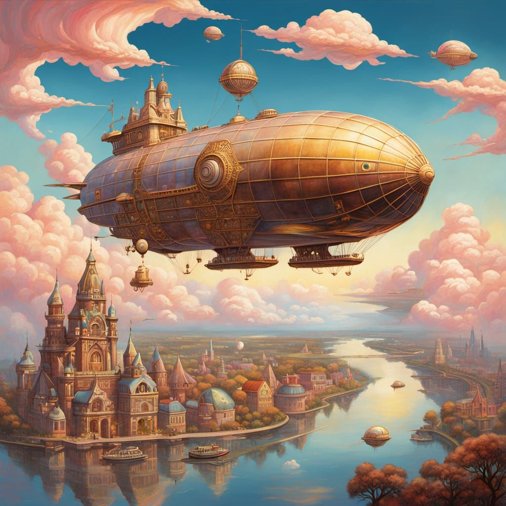 This image shows an airship floating above a fantastical city, depicted in a retro-futuristic style. The artwork features swirling pastel clouds, golden filigree details and soft, warm lighting.