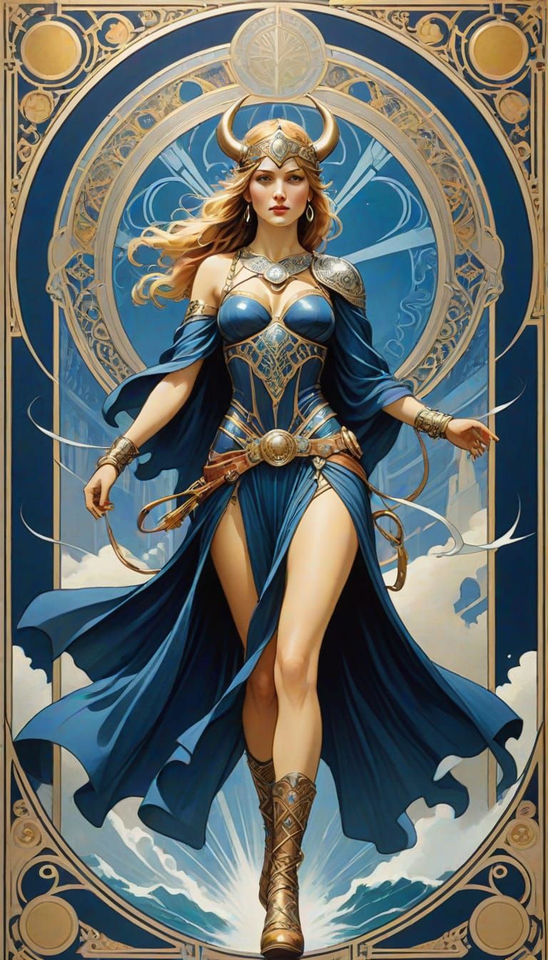 This image depicts a luxurious art deco travel poster advertising a passage to Valhalla, featuring ornate silver lettering, subtle Viking patterns, and dynamic lighting on a deep blue background.