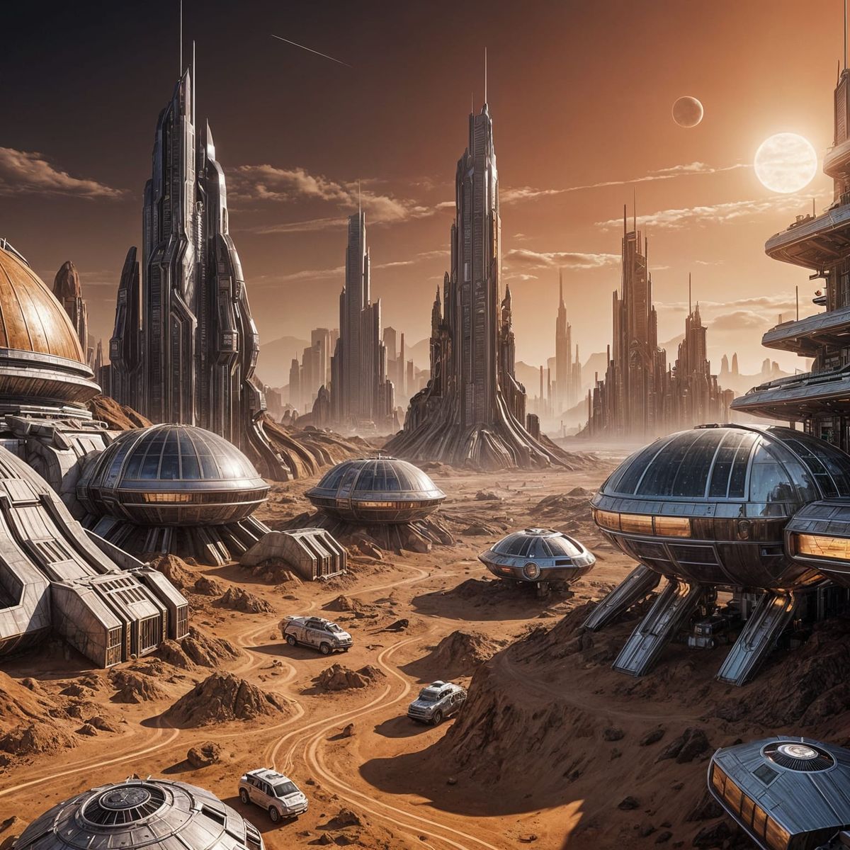This image depicts a futuristic cityscape on the red planet Mars, bathed in cinematic lighting and rendered in stunning realism, showcasing a sleek and advanced urban environment.