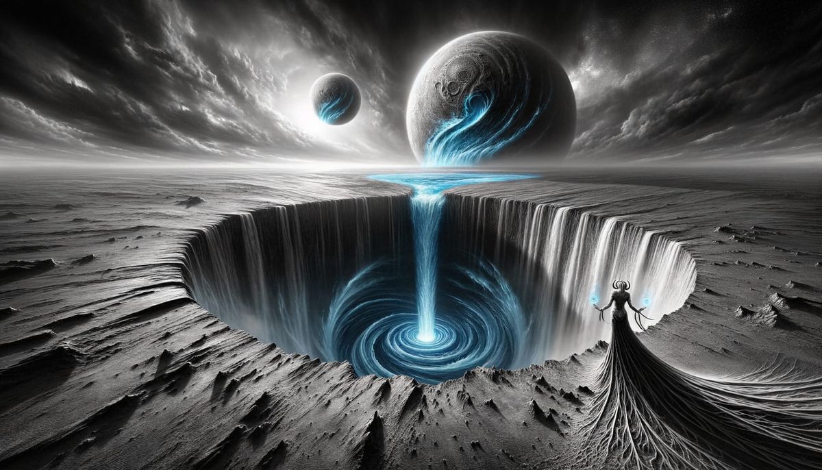 This image shows a desolate monochrome alien planet with a vibrant blue waterfall cascading into a cyclonic abyss. A Sumerian goddess figure merges lunar and terrestrial waters in a surreal scene under twin moons.