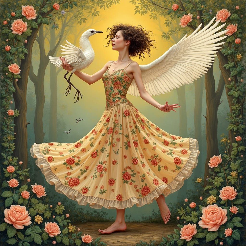 This image shows a delicate European woman with a radiant aura, dancing gracefully in a flowered alley surrounded by rose petals and green leaves. She wears a spring-inspired floral dress and holds a bird with shimmering feathers in her hands, depicted in a style reminiscent of Impressionism, with vibran...