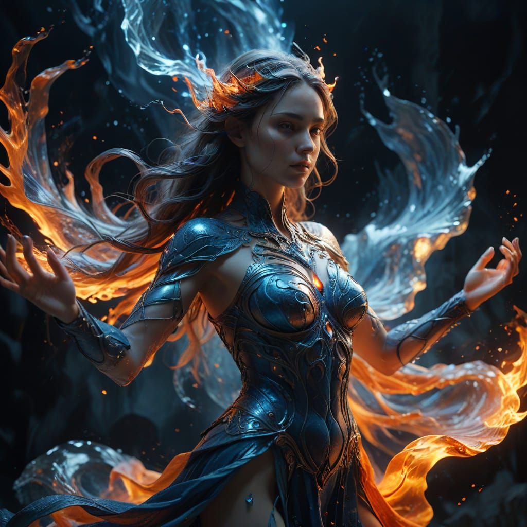 This image depicts a medium shot of a goddess embodying ice and fire, appearing as a marble sculpture. Swirling fabrics and elemental mist highlight her divine balance, with an ethereal glow and sharp, crystalline features.