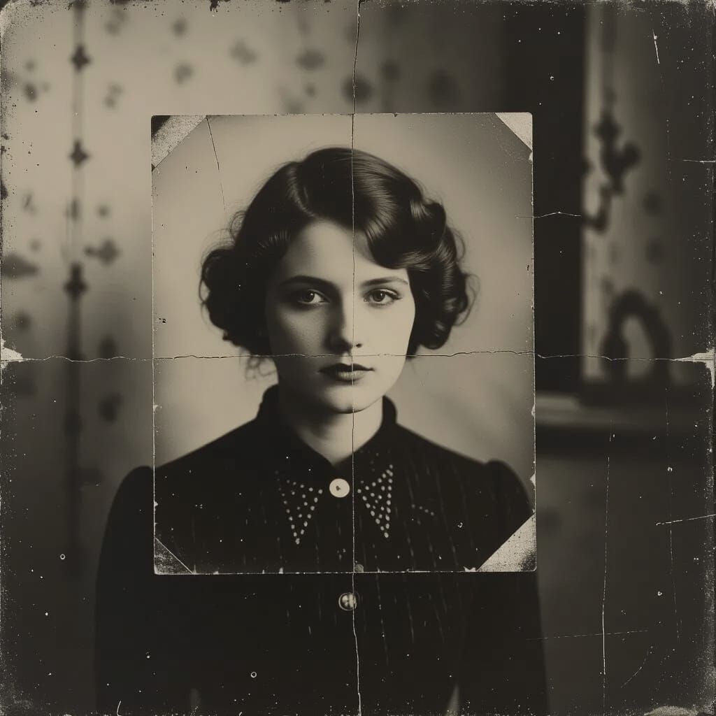 This image presents a faded antique photograph with glitch effects, rendered in grayscale. It embodies a dreamy, raw, and fragmented memory aesthetic, reminiscent of experimental archives.