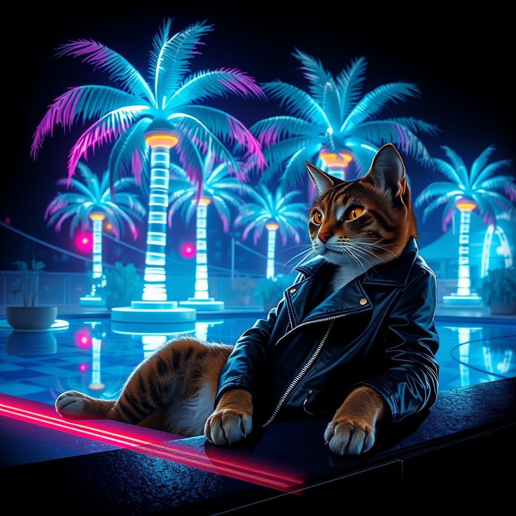 A cyberpunk cat lounges by a neon pool in a black leather jacket. This image presents a dark fantasy aesthetic with vibrant colors against the dark backdrop of a high-tech cityscape.