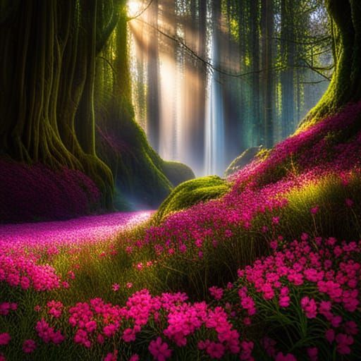 Astonishing, dreamy, Amazing Weeping trees , many blooming flowers in an epic deap perspective , waterfall streaming radiant rays Mysterious