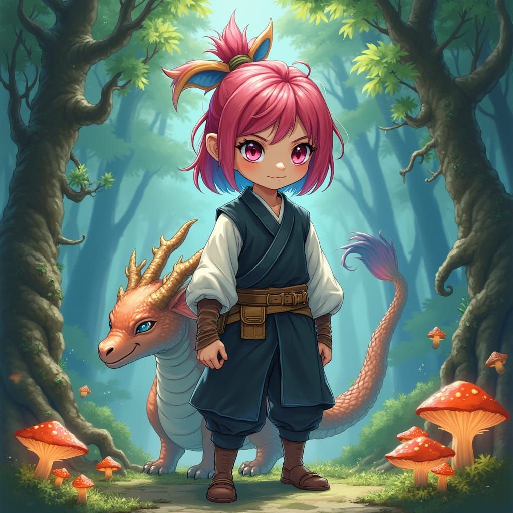 This whimsical image depicts a confident young halfling monk surrounded by a mystical forest, accompanied by a majestic spirit dragon with iridescent scales. The artwork is reminiscent of Studio Ghibli's fantastical worlds, with delicate brushstrokes and intricate textures.