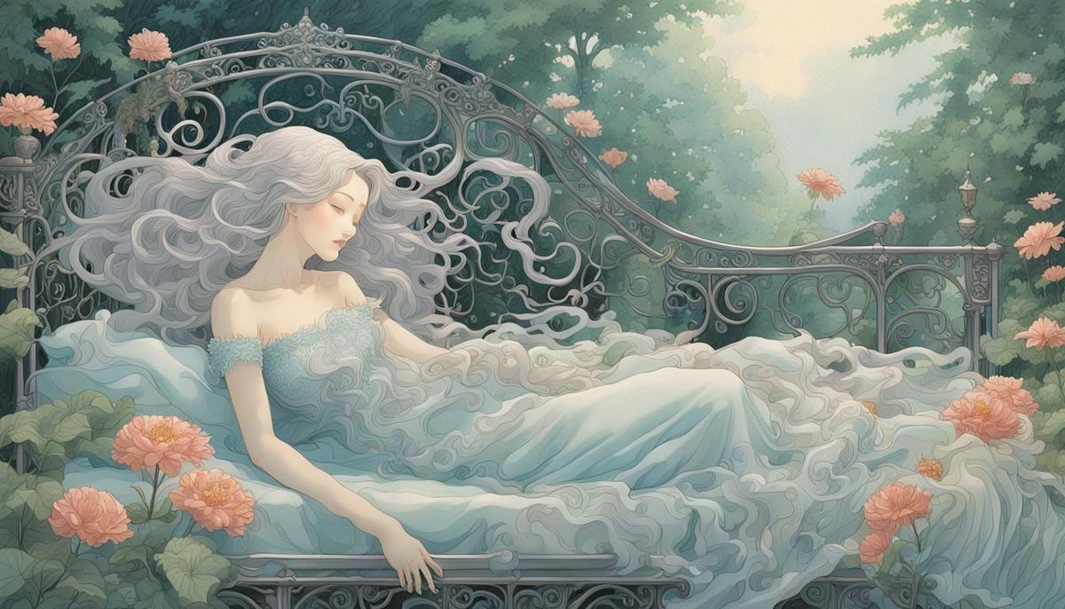 A highly detailed illustration of a siren with wavy hair, reclining on an ornate iron bed. The surreal image shows her holding a flower while floating above a forest in an etching and aquatint style.