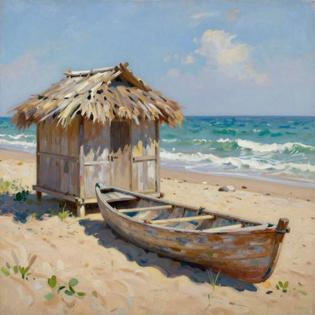 This image depicts a tranquil coastal view. A rustic beach hut and an old canoe are on the sand, with calm waves in the background. Rendered in a vibrant, impressionistic style with loose brushstrokes.