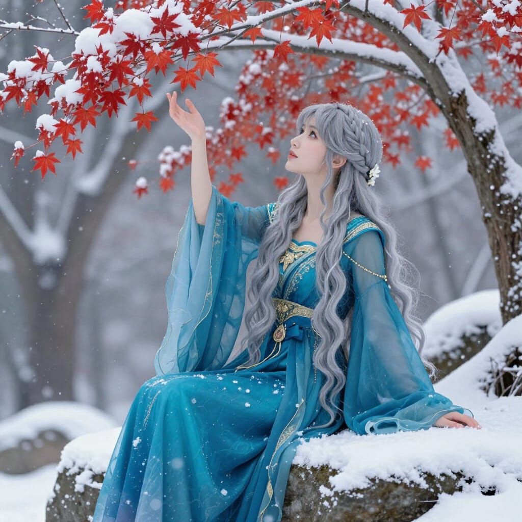 This image shows a serene figure with silver hair in an elegant blue dress amidst a snowy forest. Rendered in a detailed matte painting style with jewel tones and soft light.