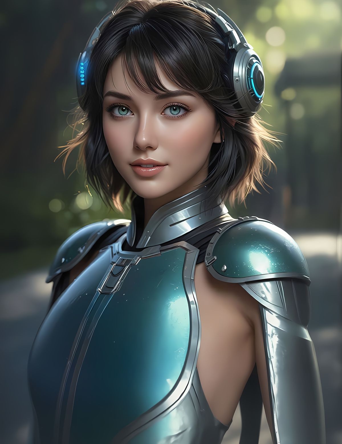 This image shows a beautiful, fair-skinned young woman with striking eyes smiling confidently. She is dressed in futuristic armor with glowing accents, creating a blend of science fiction and elegance. The artwork is hyperrealistic.