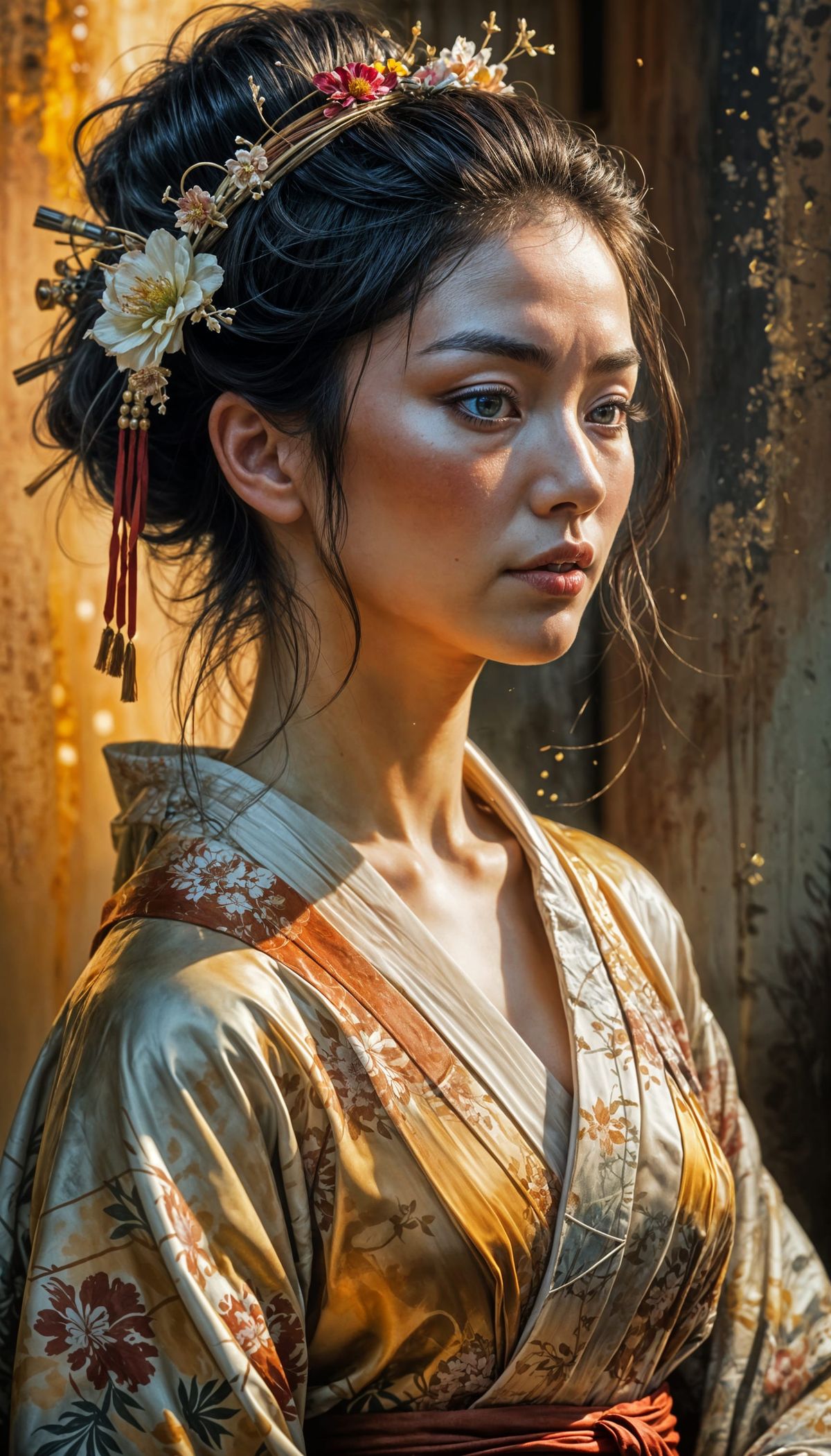 This image shows a beautiful geisha in a dynamic pose, wearing a silk robe. The image is rendered as a highly detailed watercolor painting with dramatic lighting.