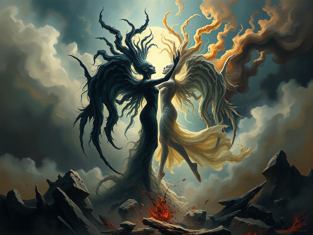 A surreal image showing the dichotomy of life through intertwined forces of light and darkness. The artwork features bold brushstrokes, vivid colors, intricate textures and swirling clouds in an abstract expressionist style.