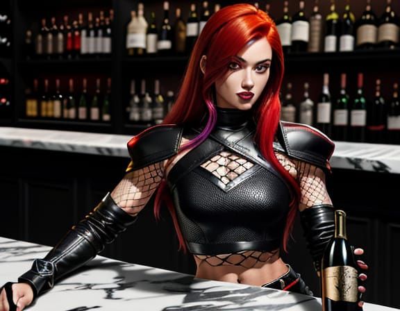 A close-up of a confident woman in a black leather top, fishnets, and boots, posing with a sword, set against a dark granite bar with wine bottles and glasses in the background, in a vibrant, high-gloss illustration style