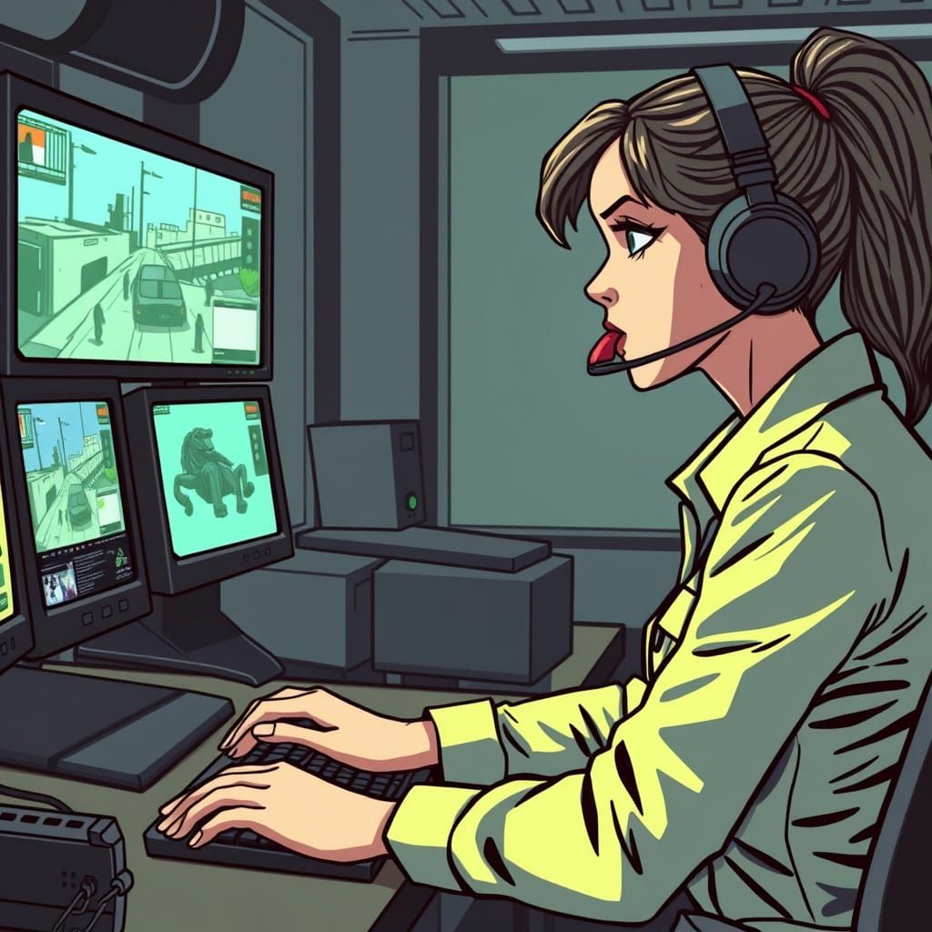 This image shows a young recruit, Jinx, monitoring Cobra operatives on a bank of screens. She relays critical intel to her team, her fingers flying across the keyboards.
