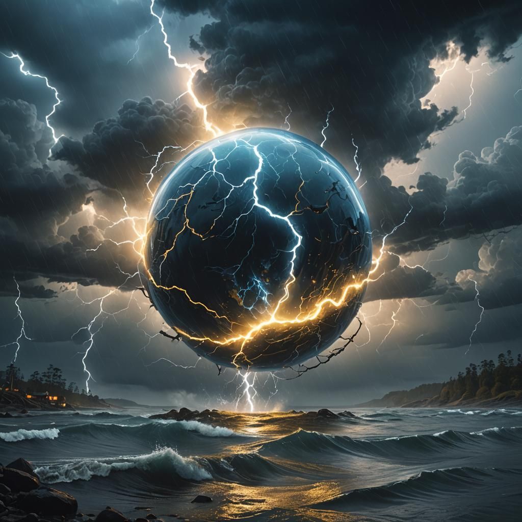 A dramatic image of a powerful storm forming a radiant sphere of water in the sky. The scene is rendered with hyper-realistic detail, showcasing dynamic lighting and a vibrant color palette in a sci-fi fantasy style.