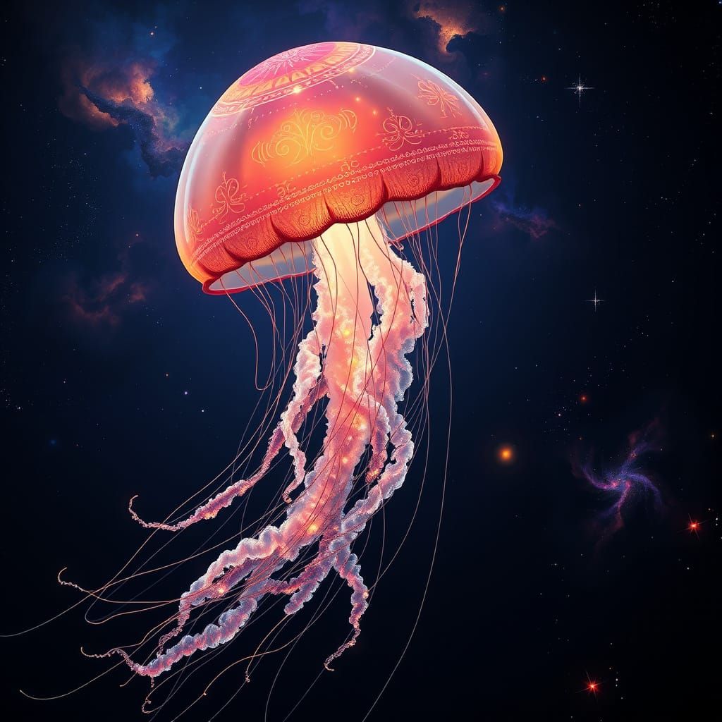 This image shows a bioluminescent jellyfish floating in deep space. The digital painting features intricate, glowing patterns and trailing stardust, illuminating vibrant nebulae with dramatic, cinematic lighting.