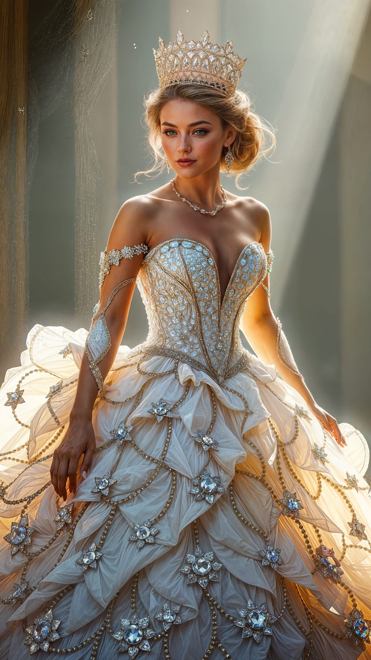 This image shows a regal queen in a hyperrealistic digital painting. Her opalescent gown, made of glass beads and crystal, sparkles like stained glass in soft sunlight.