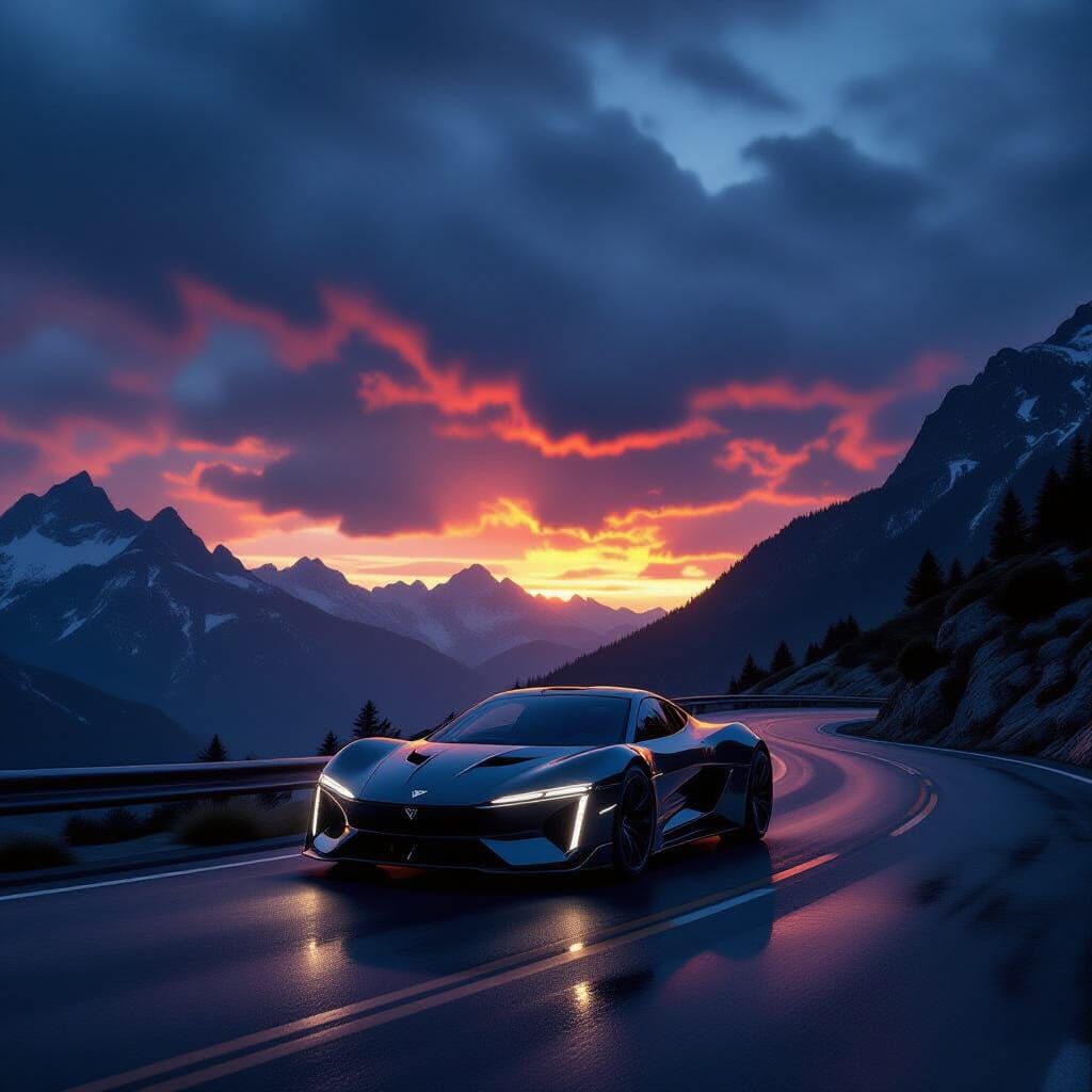 This image shows a futuristic sports car on a mountain road at dusk. The car's headlights illuminate the wet road under a dramatic sky, in a cinematic and hyper-realistic style.
