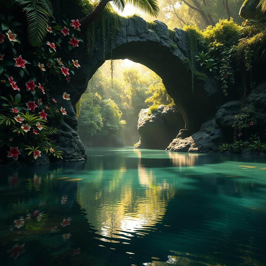 This image shows a serene, mystical landscape with a majestic rock bridge covered in tropical vines and flowers, blending seamlessly into the surrounding lush green bush, with soft golden sunlight casting dappled shadows and a moody, cinematic atmosphere.