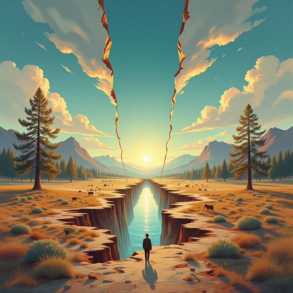 This image presents a surreal, psychedelic matte painting of a liminal landscape paused in time. A vast dimensional rift dominates the scene, revealing a hyper-saturated otherworld within its torn edges.