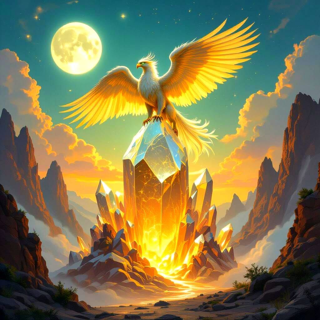 A majestic griffin with feathers like molten gold and eyes like emeralds, perched atop a colossal, ancient crystal formation that pulses with ethereal light. The scene is set in a hidden celestial valley, bathed in the soft glow of twin moons. The air shimmers with residual magic. Style reminiscent of high fantasy illustration, with the intricate detail of fantasy concept art and a touch of visionary digital art, evoking the grandeur of artists like Brom and Frank Frazetta.