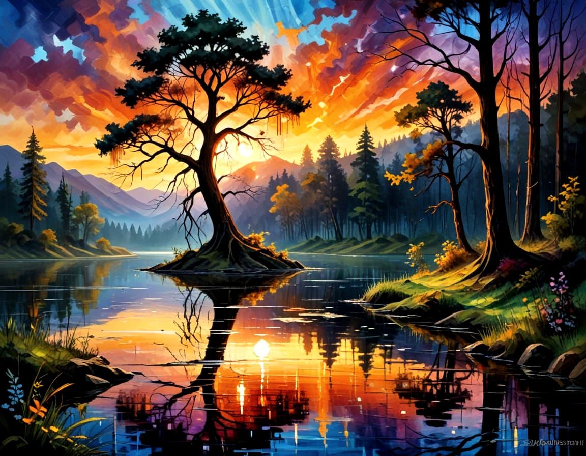 This image depicts a serene forest lake at sunrise, evoking a sense of mystique and wonder. Inspired by the vivid colors and emotive brushstrokes of Leonid Afremov's style, this digital artwork captures the beauty of nature's golden hour.