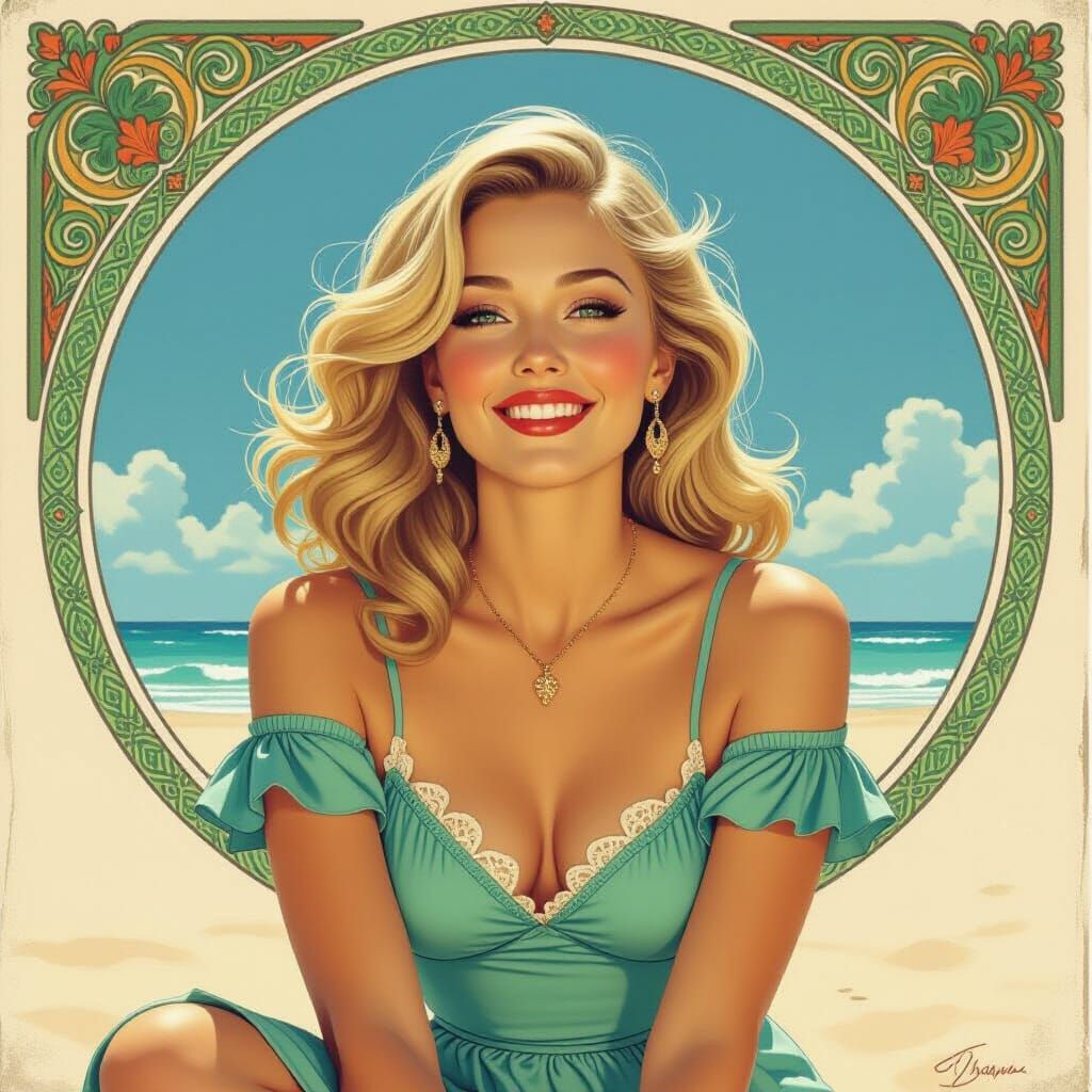 This image shows a serene blonde woman in light blue beachwear sitting on a sandy beach. The soft lighting and detailed embroidery are rendered in a photorealistic style influenced by art nouveau.