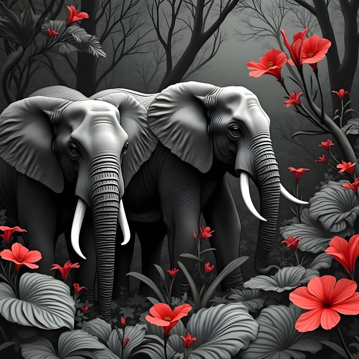 This image shows a grayscale watercolor jungle scene filled with plants and animals. Bright red elephants create a striking contrast, drawing the eye and adding a surreal touch to the diffused light charcoal drawing.
