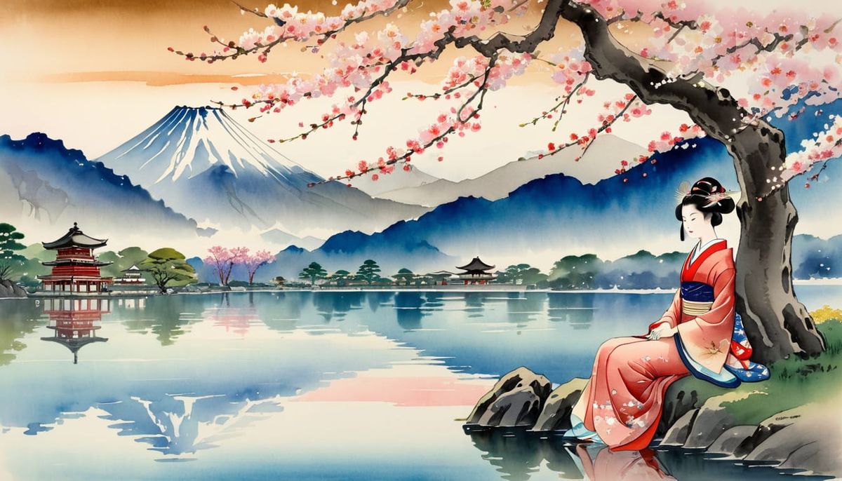 This image shows a geisha seated beneath a cherry tree near a lake. Mountains and temples appear in the background, rendered with traditional Japanese ink and watercolor techniques.