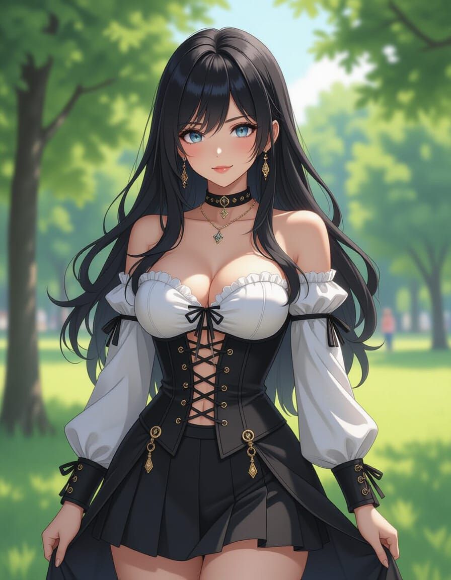 This image shows a 22-year-old Dominican woman with long black hair and gray eyes in a vibrant public park. She is wearing a gothic-style bustier and micro skirt, rendered in an anime aesthetic.