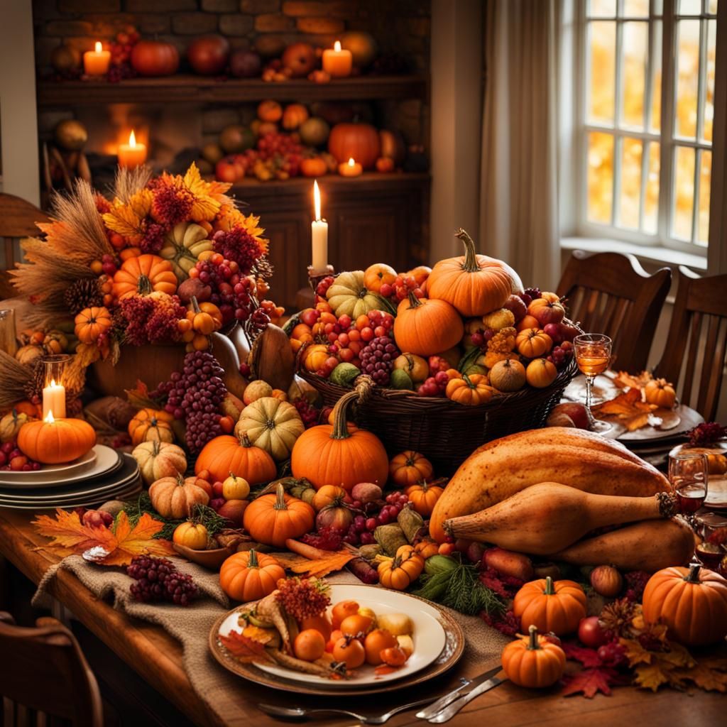 This image shows a Thanksgiving cornucopia overflowing with harvest bounty. The warm colors and inviting scene evokes feelings of family togetherness, hope, and the promise of a great feast.