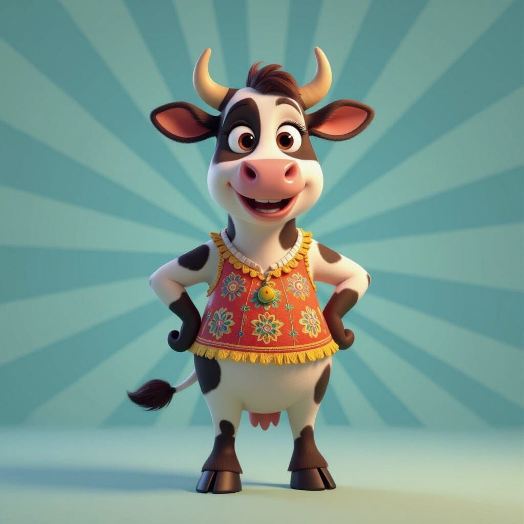This image features an attractive anthropomorphic female cow standing on her hind legs, dressed in a vibrant outfit. Rendered in a Pixar animation style with 3D digital art and cinematic effects.