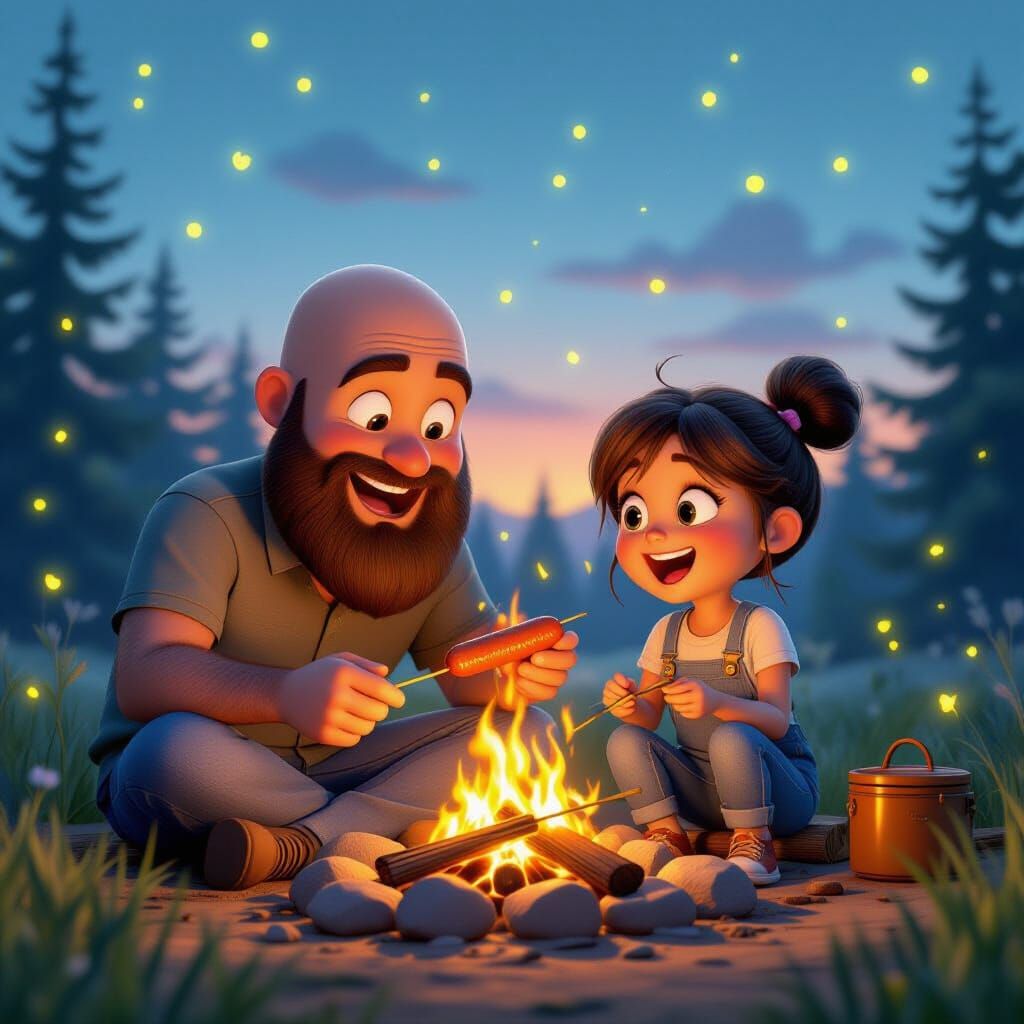 This image shows a father and daughter laughing while roasting hotdogs around a campfire. Fireflies light up the meadow in this vibrant, 3D rendered scene with bright, cinematic lighting.