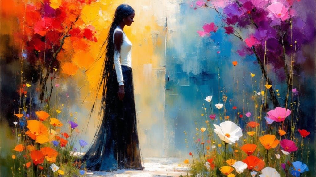 This image shows a porcelain-skinned woman in a black and white suit amidst a fantasy environment with trees made of glistening gems. The scene is full of vibrant color, rendered in an impressionistic style.