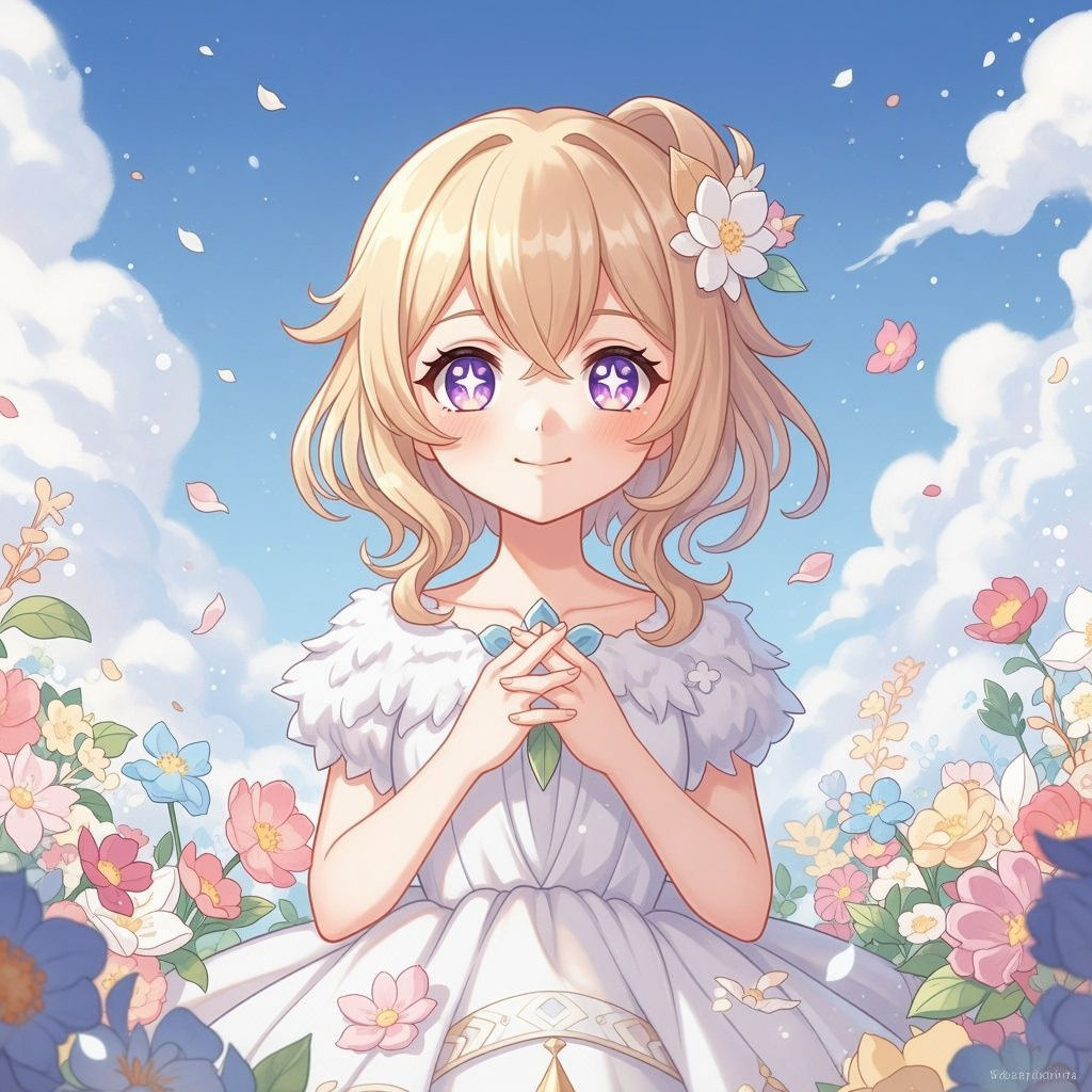 A charming picture of a 4-year-old girl named Sophie with sparkling purple eyes. This delightful children's book illustration features soft pastel colors and a gentle expression in an anime aesthetic.