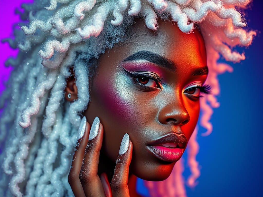 This image showcases a dark-skinned beauty with a mesmerizing afro-textured mane of long, icy white hair, adorned with micro-glitter particles and chunky white glitter on her face, creating a kaleidoscope effect. Her makeup artistry is hyperrealistic, with bold, vibrant hues and a dramatic, otherworldly ...