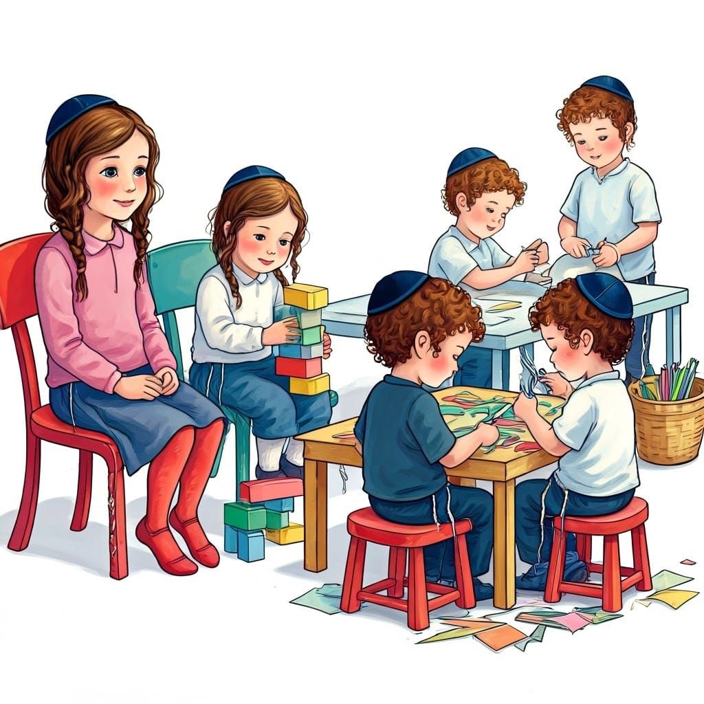 This image shows two modestly dressed Orthodox Jewish girls sitting on colorful chairs in a serene courtyard, surrounded by energetic boys playing and creating. Inspired by Chagall's folk-art style and Matisse's vibrant colors, this illustration blends traditional and modern elements.