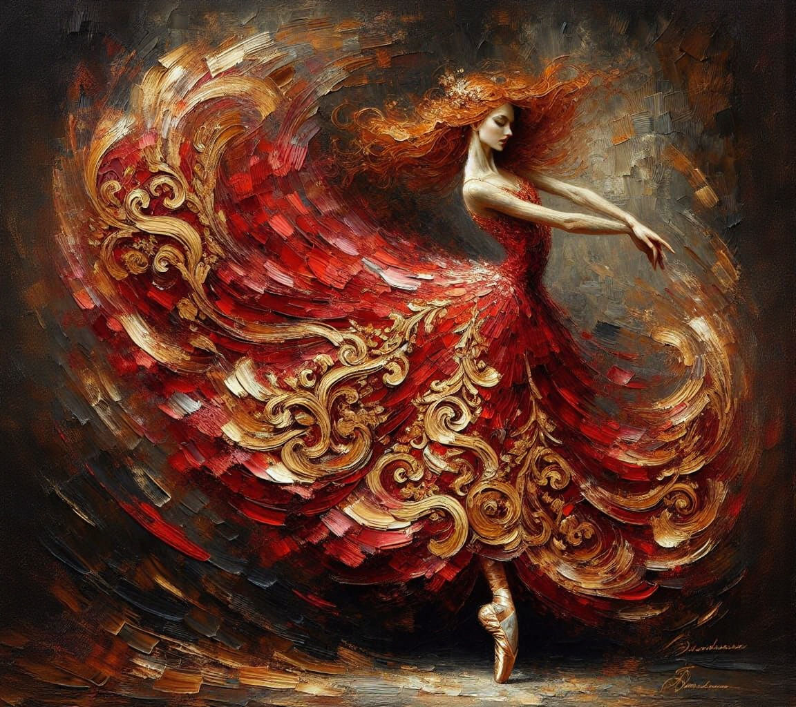 A striking picture of a ballerina in a red dress. The image, created with expressive brushstrokes, captures the dancer's kinetic energy and ornate golden patterns in an impasto style.