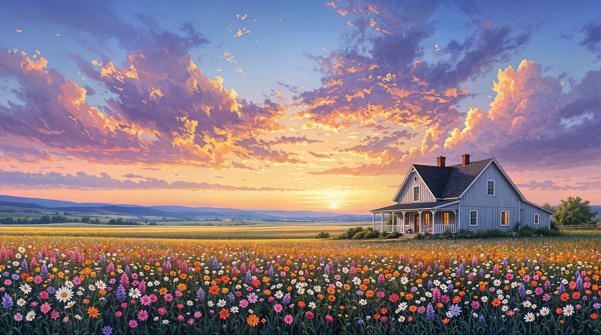 This image shows a peaceful farmhouse scene at sunset, with a vibrant field of wildflowers stretching towards the rolling hills in the background. The sky is painted with soft, impressionistic strokes, blending deep blues and purples with warm pinks and golden light.