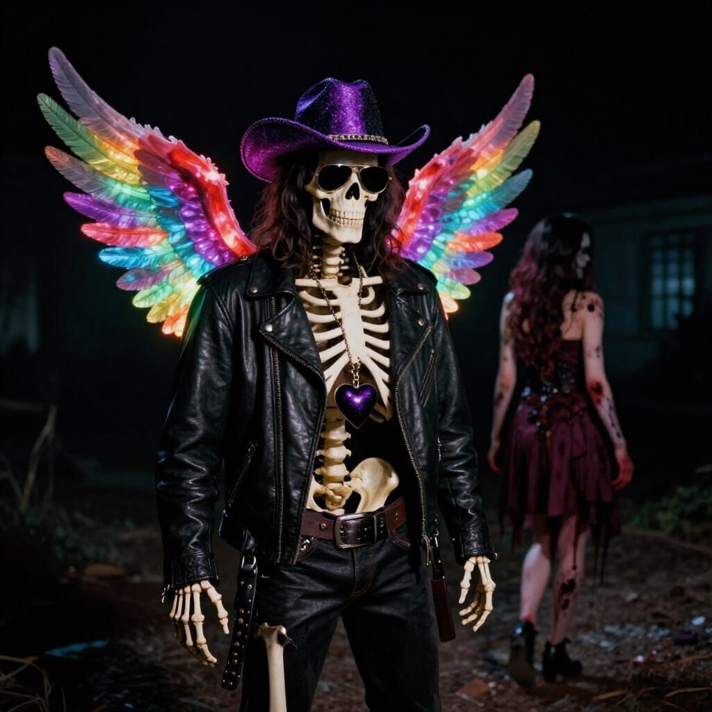 This image shows a skeleton figure with rainbow wings reaching towards a departing zombie woman in a dark, atmospheric setting. Captured as a cinematic film still with vibrant lighting and film grain.
