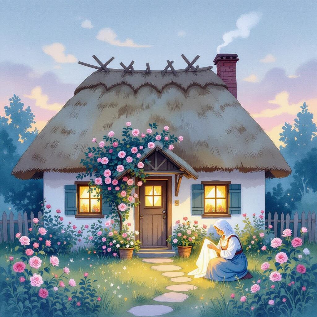 A watercolor illustration of a Ukrainian cottage at twilight, surrounded by blooming wild roses. The image evokes a dreamlike storybook atmosphere in a stylized anime-inspired rendering.