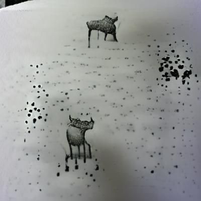 This image shows a stippled, black and white illustration of an undead deer. The deer stands in a snowy forest landscape, rendered in a detailed stippling style.