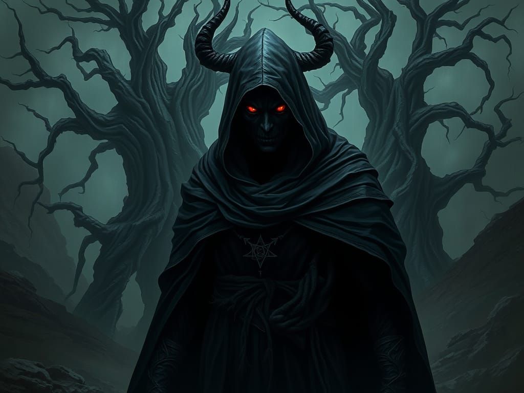 This image shows a cloaked figure with glowing red eyes standing in a desolate landscape with gnarled trees. The dark fantasy art style evokes a sense of eerie atmosphere and intricate detail.