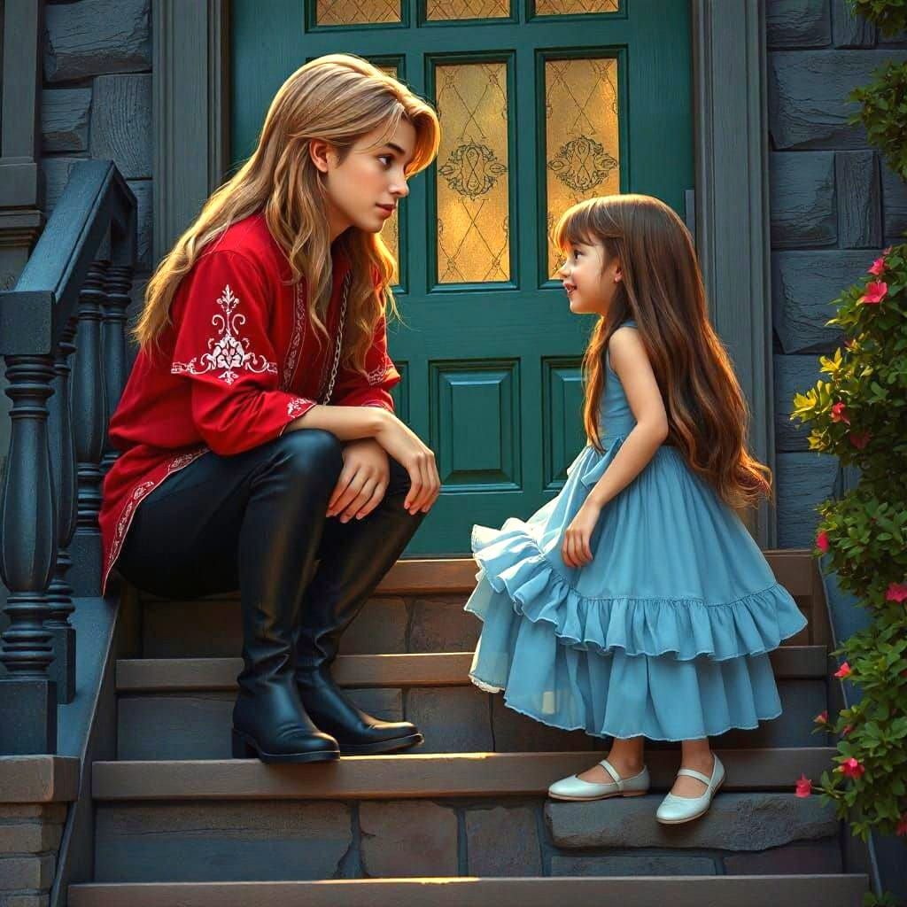 A detailed portrait of a blond man meeting a brown-haired girl outside a house. The art features dramatic lighting and ornate details with vibrant colors and volumetric light.